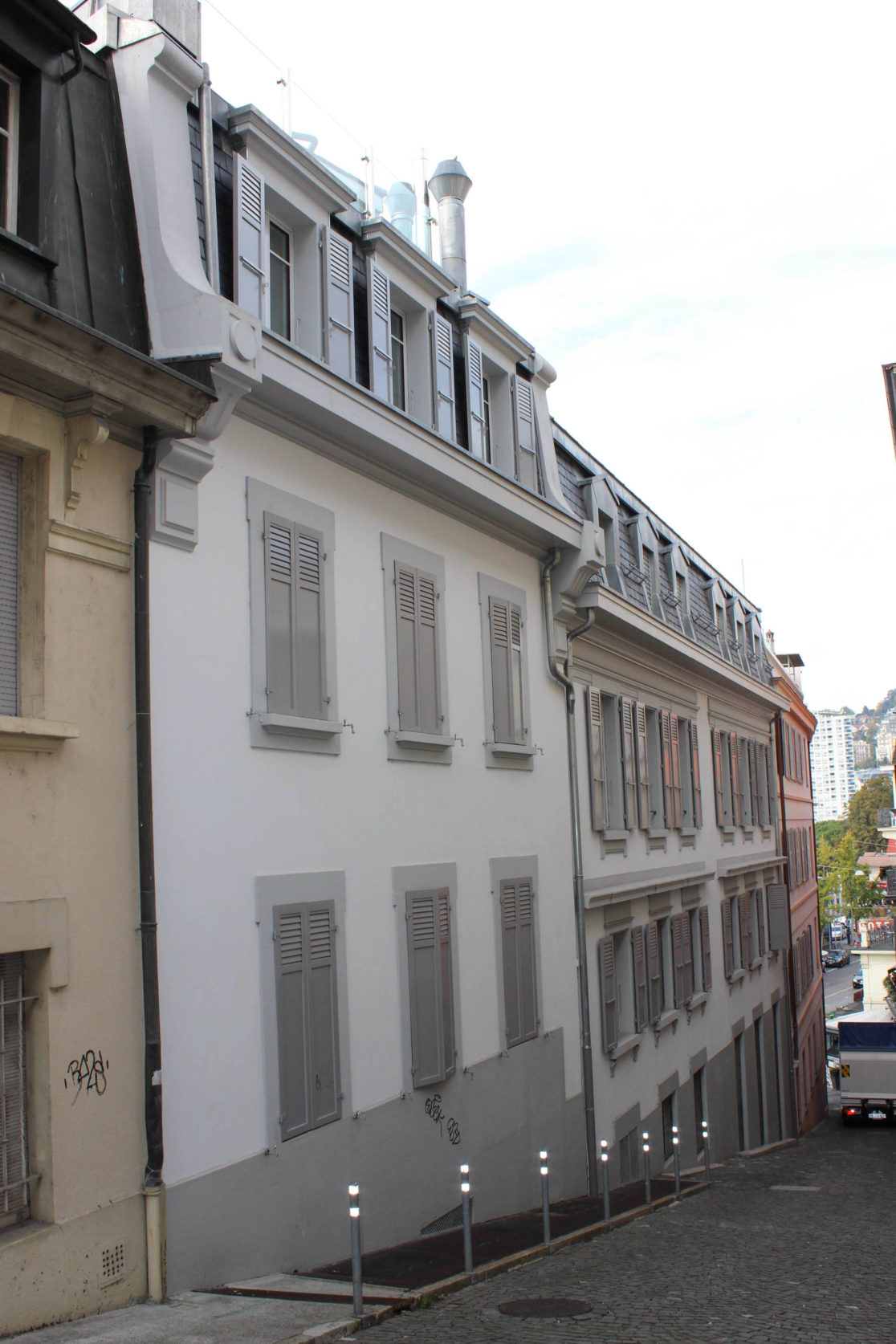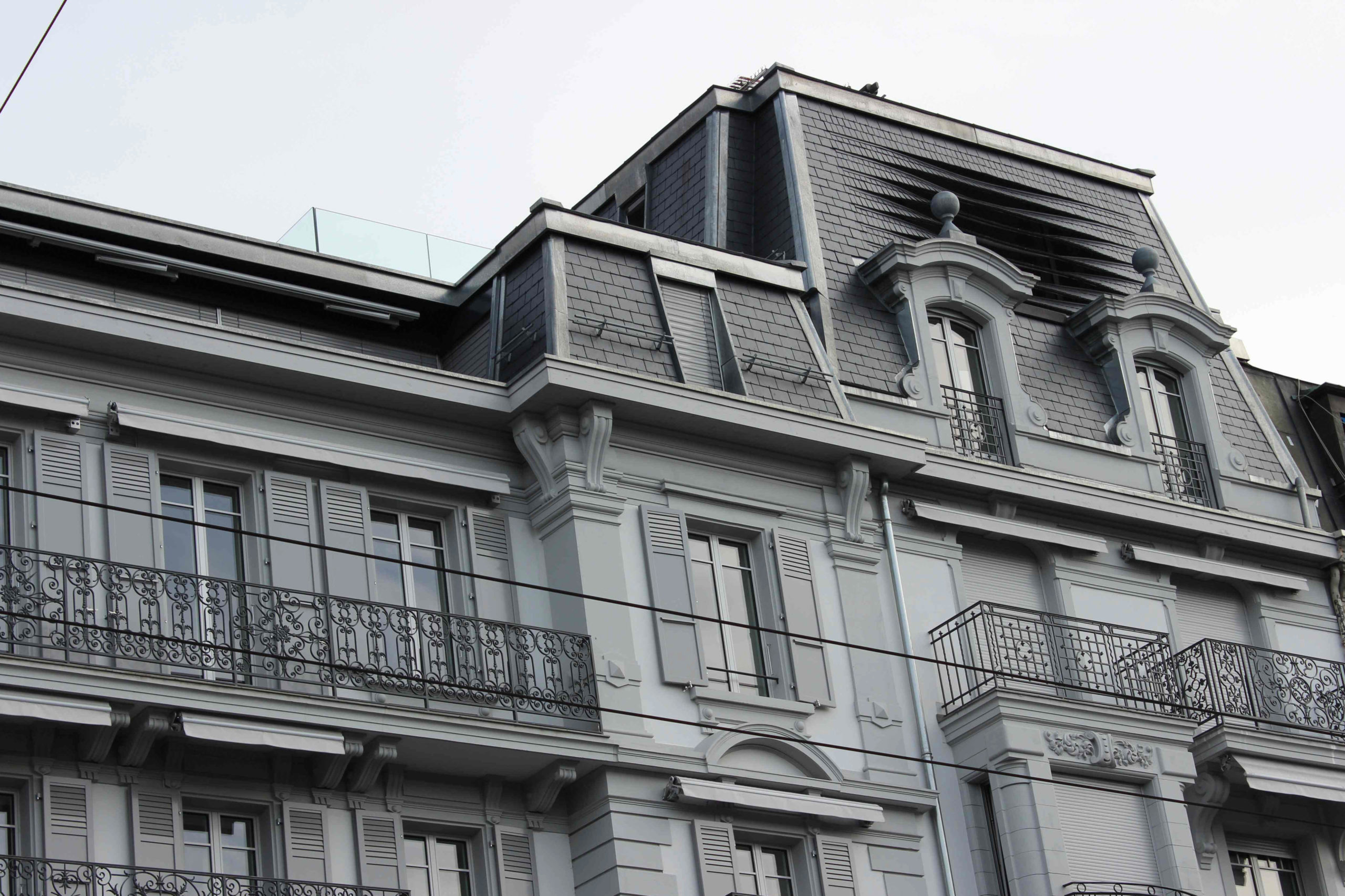 Transformations d’un immeuble résidentiel de 9 appartements et de commerce, création d’ouvertures et terrasse en toiture, pose de panneaux solaires.